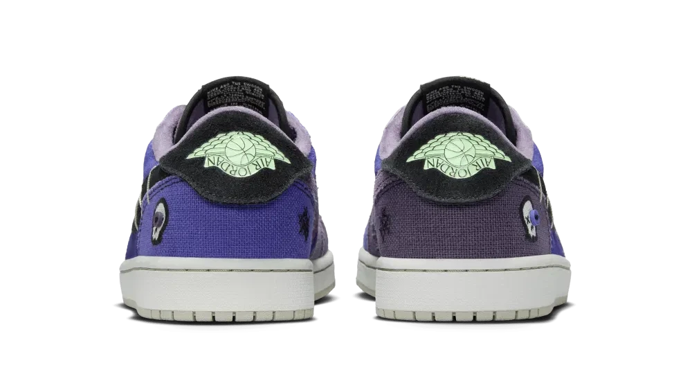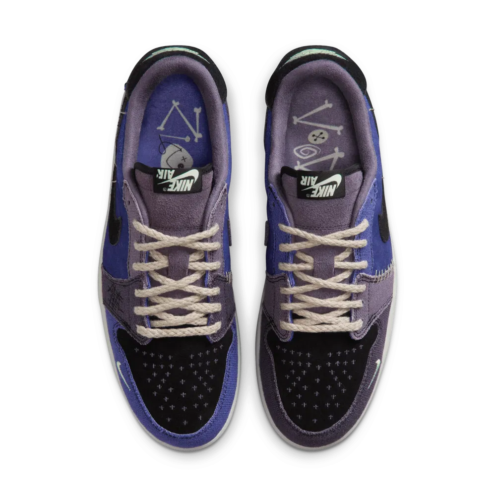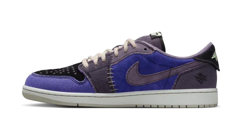 Destacam-se os detalhes irregulares: o Swoosh mini invertido, logos “Nike Air” e Wings virados ao contrário, e o bordado de um símbolo de boneco voodoo no calcanhar, que reforçam a temática mística e artesanal da peça.  Com acabamentos de estilo “raw edge” e atacadores em estilo corda, este AJ1 Low OG assume-se tanto como peça de coleção como opção de destaque para street-style.