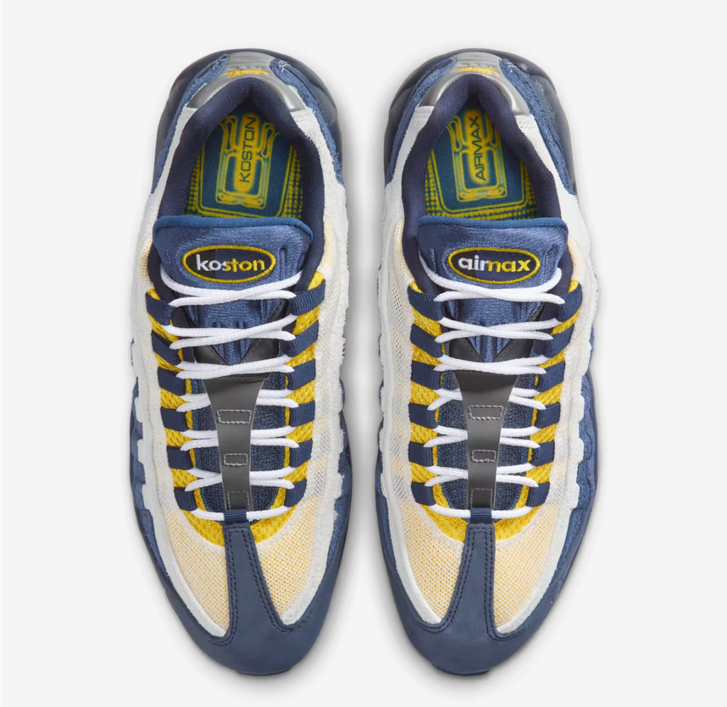 Nesta edição, o cabedal combina camurça e malha nas cores “Obsidian” (azul-escuro) e detalhes “Speed Yellow” vibrantes, além de acentos em Summit White e Midnight Navy. Elementos únicos incluem os logotipos “Koston” e “Air Max” na língua, inscripção em tailandês na biqueira — homenagem às origens de Koston — e reforços específicos para skateboarding como dupla costura em zonas de maior desgaste e solado com padrão em espiga para melhor aderência.